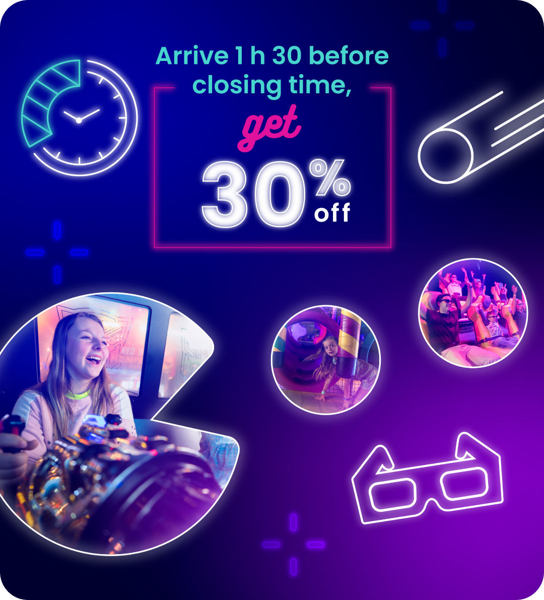 At Arcade Carie Factory, we reward you for your late-night visits! Arrive 1h30 before closing and get 30% off. Yes, 30%!