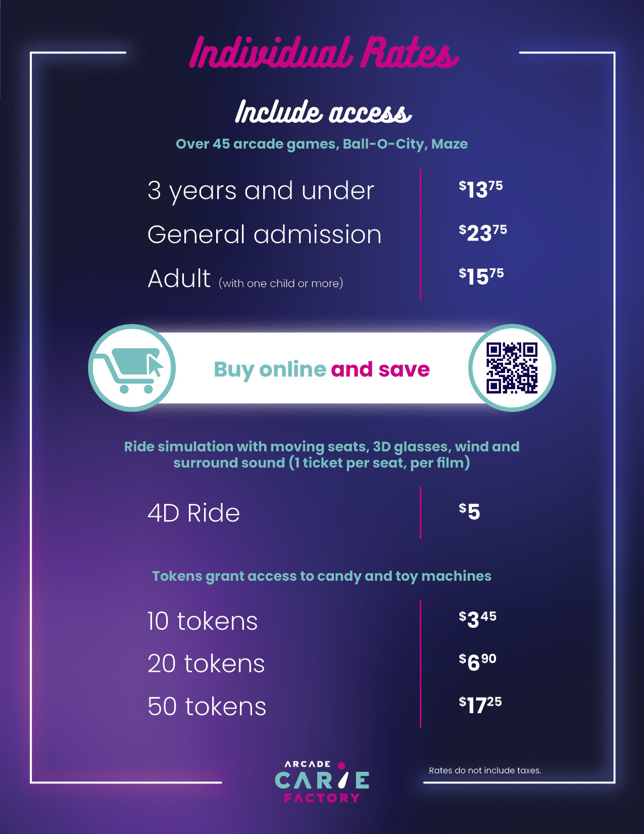 Because memories are the best gifts we can offer, the Arcade Carie Factory gift card is a present that’s sure to please every time. Give your loved ones an unforgettable moment of joy and fun.